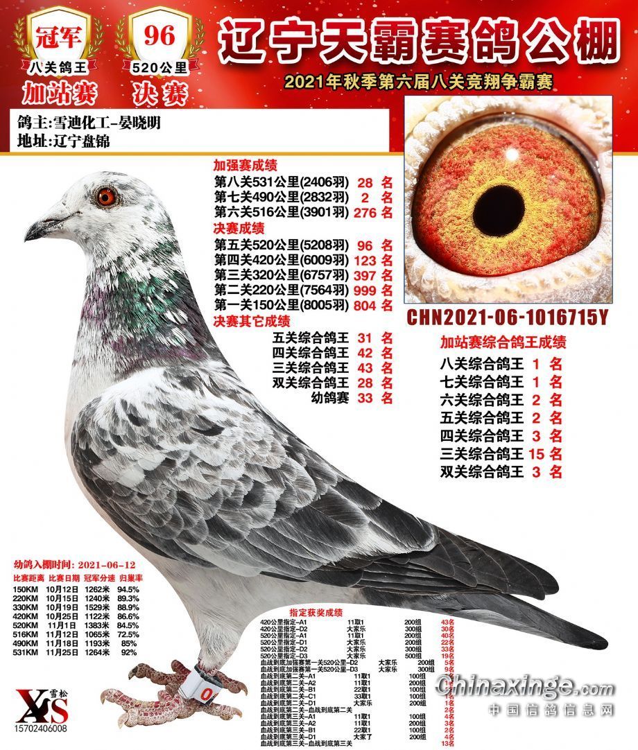 辽宁天霸赛鸽公棚今年暴打十关赛,在八关结束后,雪迪化工-晏晓明的2021-06-1016715麒麟花一关更比一关好,爆发出惊人的实力。八关分别拿下804名、999名、397名、123名、96名、276名、2名、28名,关关进入1000名,最终,获得七关、八关鸽王冠军,五关、六关鸽王亚军,双关、四关鸽王季军等多项鸽王头衔,霸气侧漏。最终在拍卖会上,也以超高价格成交。