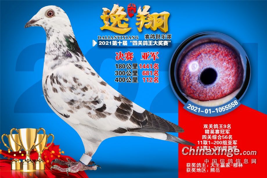 大连逸翔赛鸽俱乐部2021第10届秋赛设有180公里、300公里、400公里、500公里四关赛事,天生赢家-穆林的一羽花鸽越飞越快,从首关千名开外,到二关681名,再到三关112名,决赛更是实力发挥,夺下亚军,同时斩获精英赛冠军、双关鸽王9名及多项指定,令人刮目相看!