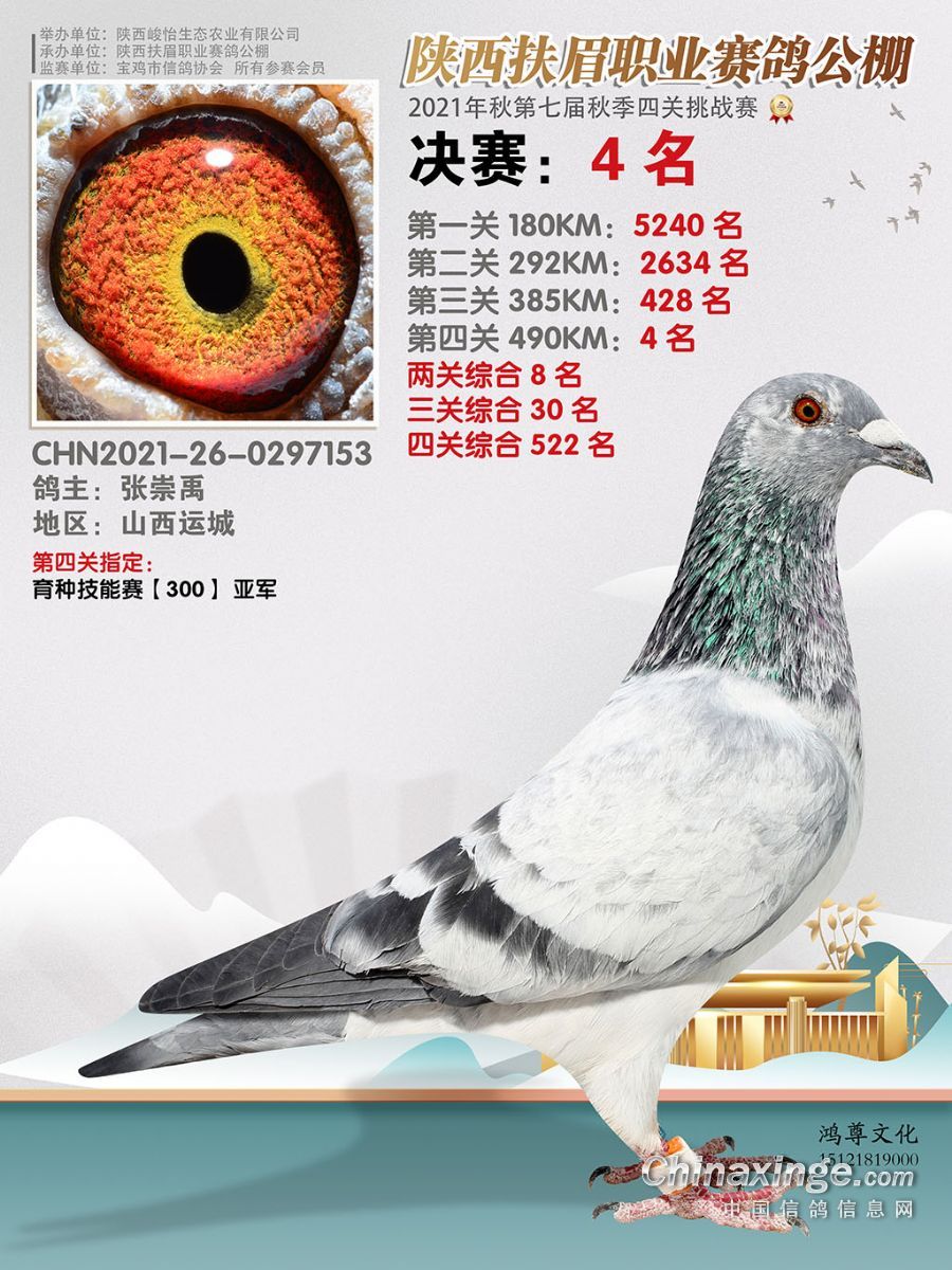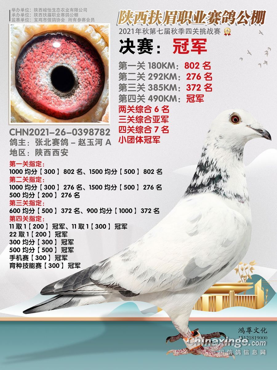 陕西扶眉公棚四关苦战披荆斩棘,前三关比赛,三战三胜,飞出了高归巢率、高分速的出色战绩,第四关500公里决赛4075羽赛鸽出击,14点48分29秒,一羽白袍小将破空而来,快速入棚拿下冠军,是张北赛鸽-赵玉河的2021-26-0398782白花鸽,分速为1282.1517米/分。这羽四关比赛超级稳定,均在1000名之内,获得双关鸽王6名、三关鸽王亚军、四关鸽王7名,同时赢得多项指定赛成绩。