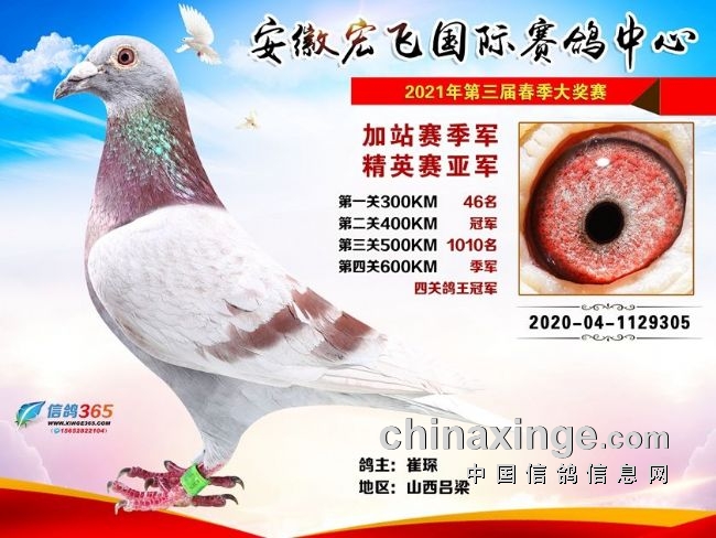 同样来自安徽宏飞的还有另一羽红袍小将,这羽来自山西鸽友崔琛的2020-04-1129305赛鸽,在安徽宏飞2021年春赛中第一关斩获46名,第二关斩获冠军,不过决赛发挥失利,在万名之外。600公里加战赛再度发挥,斩获季军,最终取得四关鸽王冠军、精英赛亚军,称得上一羽好鸟。