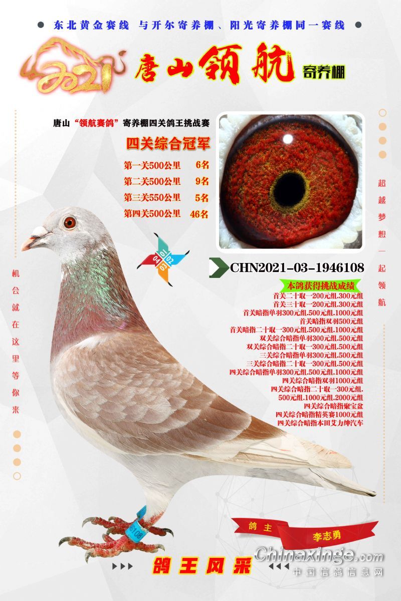 唐山领航国际寄养棚2021年四关鸽王挑战赛,设有500、500、550、500公里四关比赛,司放东北黄金赛线,与开尔寄养棚、阳光寄养棚同一赛线,八只职业团队参赛,群雄逐鹿,争霸鸽王。天翔团队最终前十进六,其中麾下李志勇的赛鸽表现神勇,包揽鸽王冠军、亚军,其中2021-03-1946108红绛花鸽,飞出了一关6名、二关9名、三关5名、四关46名的卓越成绩,以1164.6730米/分的平均速度获得鸽王总冠军。