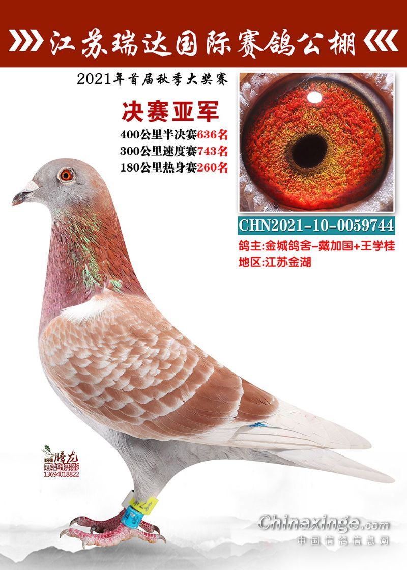 同样是来自江苏瑞达国际赛鸽秋棚的决赛亚军,也是一羽飒气十足的绛鸽,这羽赛鸽是来自金城鸽舍-戴加国+王学桂的一羽2021-10-0059744,这羽赛鸽关关均在千名之内,最终强势登上亚军宝座。