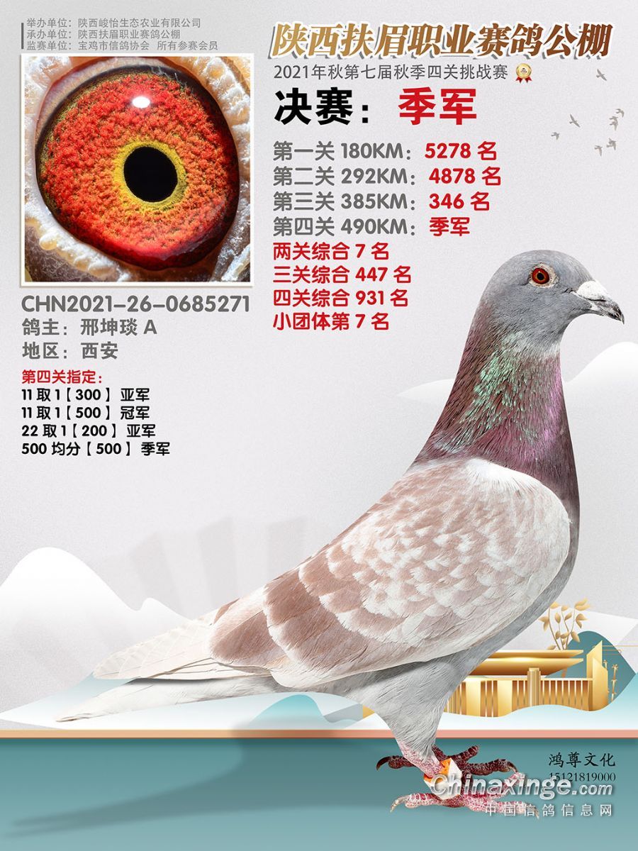 陕西扶眉公棚2021年第七届竞赛经过四关苦战,邢坤琰的一羽2021-26-0685271红绛鸽披荆斩棘,获得决赛季军,与亚军仅差三秒钟,这羽赛鸽真正体现了什么叫步步为营强势逆袭。首关5000名开外,二关也不紧不慢4000多名,第三关开始发力,飞进前500名,第四关决赛强势出击,飞出季军,同时获得两关综合7名、小团体7名。