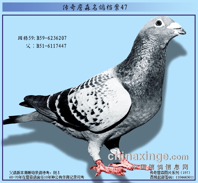 斑格51是维他斯育出的,这是在它被拍卖掉的同一年的事情。当然,当时如日中天的詹森兄弟,根本就不在意这羽“斑格号”将会跟他们产生那一种微妙的关系。 红狐49的父鸽是“浅灰斑白眼46”。一天之后,这羽“46”也几乎被佛兰德某一位鸽友购走。但是,幸好这位客人不喜欢这羽鸽子在喉部出现的一个白点,结果没有完成交易。“红狐49”的母鸽是“奇狐雌45”B45-411053,也就是斑格51的祖母,人类辈份的奶奶,它很可能是詹森鸽舍空前最杰出的产物之一,自然也是最出名中的一羽。 那个年代,区内无人不晓得这羽雌鸽。并不是因为鸽报的吹嘘,也不是因为在售鸽说明书上的夸张描绘,完全是来自它那杰出的赛绩,在广泛的附近地区,每位鸽友的鸽子都曾被它毫不留情地击败。
