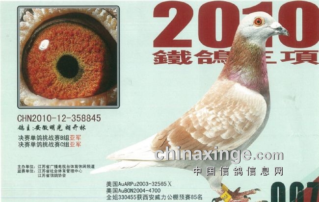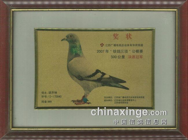2005年,马鞍山公棚赛后的名家归巢鸽,“物不美、价不廉”的无人问津,胡开林见到一羽玲珑红绛雌鸽(AU-2005-4700),还算上眼,便接回给家里与另一羽“歪果仁”拉郎配,生塞到一起。隔年(2007年)出了一对顺雄幼鸽,当作陪绑送到了江苏铁鸽三项公棚。