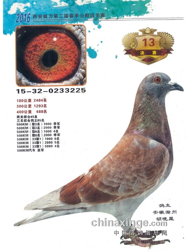 在选送公棚选手方面,胡老不太会看鸽子,也对那些“亭亭玉立、体貌健硕”的鸽子伤透了心,在他看来,幼鸽只要结实、强壮,整体上没有明显缺点,在群体中表现出鸽子聪明的本能,就应该送到赛场上去验证。好的鸽子,真的不一定多漂亮,但一定很强壮。 由于胡老年事已高,伭不敢久谈过问。在数日的语音和交流中,能够深切感受到胡老对红狐家族充满了自信、满足且略带歉疚,希望通过伭的拙笔,婉转表达出红狐奇缘和家族南征北战、建立功勋的鸽者真情,以不负对该篇报道“真实写照、切记浮夸”的嘱托。 最后,再次感谢鸽友的浏览阅读!感谢对本篇不足的批评指正!肯请,谨慎评论、以尊长者!谢谢!