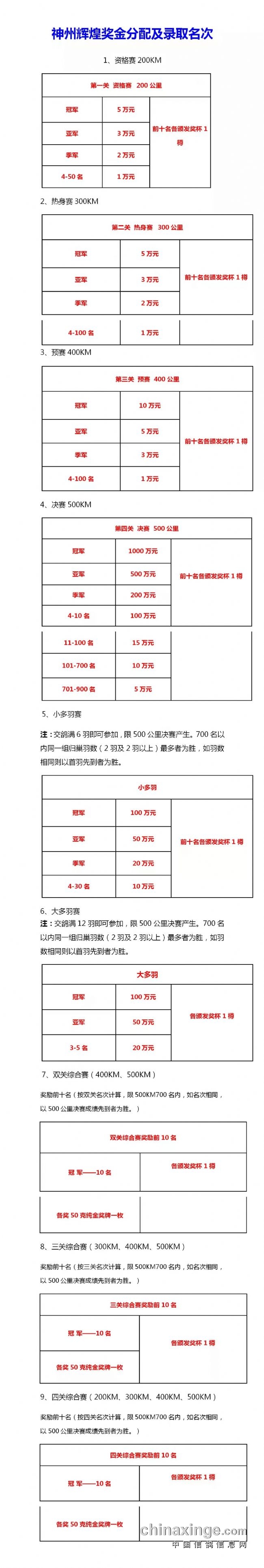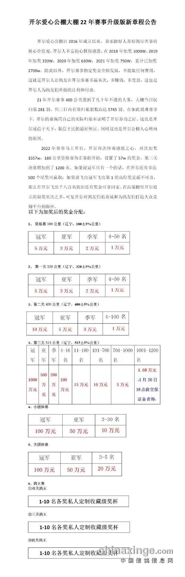 15日早,位于辽宁省葫芦岛市东戴河经济开发区的神州辉煌公棚发布2022年的竞赛规则。将参赛费提高到每羽赛鸽16800元,与唐山开尔持平,并列为中国收费最高的公棚。在奖金分配上,也与开尔相差无几,只是其资格赛取50名,总奖金57万;决赛701-900的奖金为5万元。(开尔初版章程701-900名的奖金为1.68万元,且需要提前缴纳保证金)。小团体季军奖金为20万元,开尔大棚为10万元。