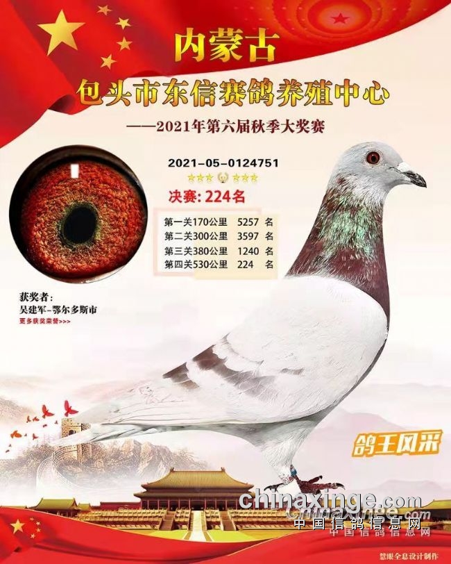 2021年,包头东信公棚仅参赛3羽,两羽是谢晋生老师的老红鬼072近亲直孙、桑杰士916近亲直孙交配马爱国老师的电脑桑杰士,一羽获200公里171名、300公里472名、400公里497名;另一羽获决赛530公里227名;第三羽是交朋友的鸽子,530公里飞失。