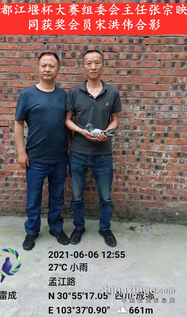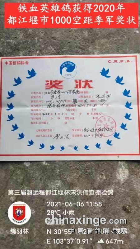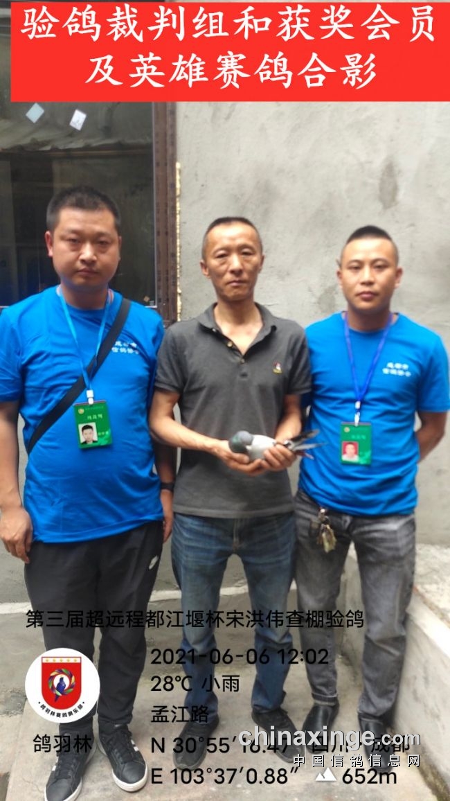 鸽主宋洪伟会员今年50多岁,自幼喜爱信鸽,其父宋义明老先生早年就已是都江堰赛鸽名家,曾经为寻觅良种不惜重金。老宋养鸽不多,纯属业余爱好,参加远程联赛一直成绩稳定。去年全市600空距放5归5、700空距放3归3、1000空距放1归1;今年600空距放3归2(丢的一只正是今年超远程灰雄的同窝雌)、700空距放2归1,就这只“独苗”成为超远程赛不死必归的“铁血英雄”,书写本届都江堰杯大赛获奖鸽的奇迹,也扞卫了都江堰这个小城在远程赛场的历史地位!