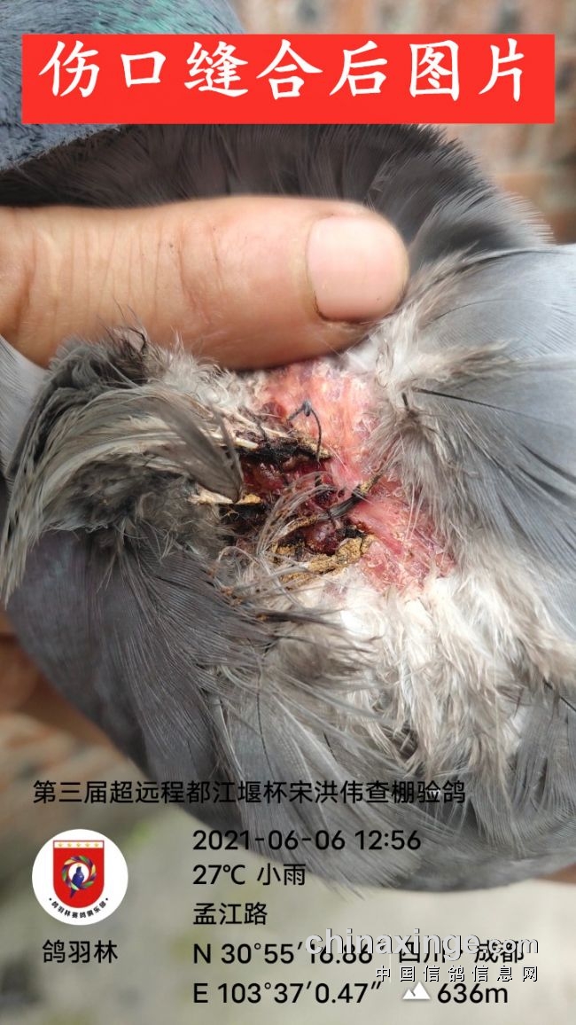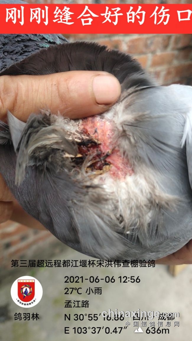从2020年6月5日的1000空距都江堰市季军,这羽赛鸽就是胸部撞伤的情况下归巢。到2021年6月6日成都市1300空距级季军,归巢后,鸽主发现灰雄站在笼中略显疲惫的,胸面前有滩“水”。定睛一看,才发现灰雄胸前有道伤口,有足足4厘米长,划破了嗉囊壁,鲜血已干,原来灰雄受伤了,而且伤得不轻。刚看到面前那滩水,就是它喝进去又顺着伤口流出来的,最终伤口足足缝了5针!两次千公里以上空距,两次带伤奋飞,两次不死不归,两次高位入赏,这是怎样的一羽英雄川鸽!这是怎样的一羽超远程精英!也正是如此,会员宋洪伟的这羽英雄鸽,书写连续2年大满贯赛事,连续2年1000空距以上神勇归巢的奇迹!