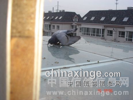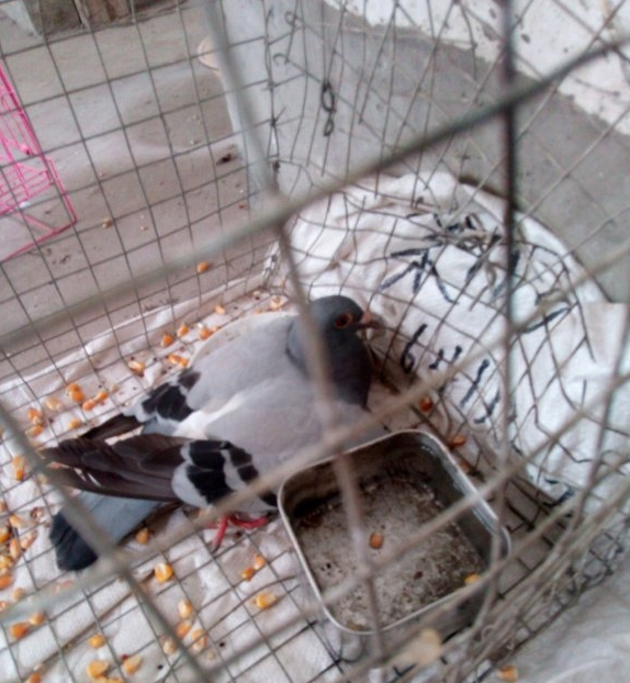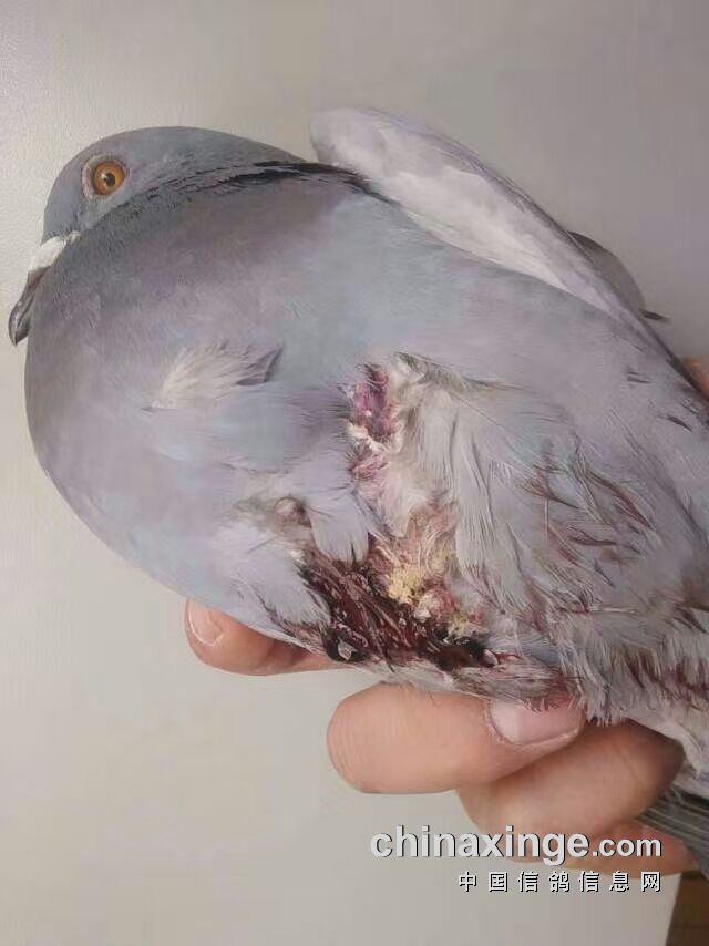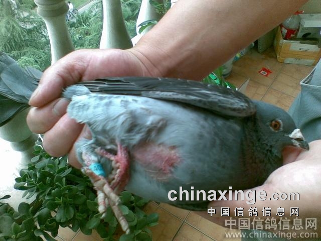 20、“威廉”:折断双腿,重伤归来!这羽鸽是鸽主的1号种雄“老威廉”的后代,鸽主对其爱护有加。在一次家飞训练中,漫天大雾,鸽子飞走后迟迟未归,鸽主心急如焚。一周后鸽子重伤归来摔倒在棚上,双腿均已折断,腹部羽毛尽失。