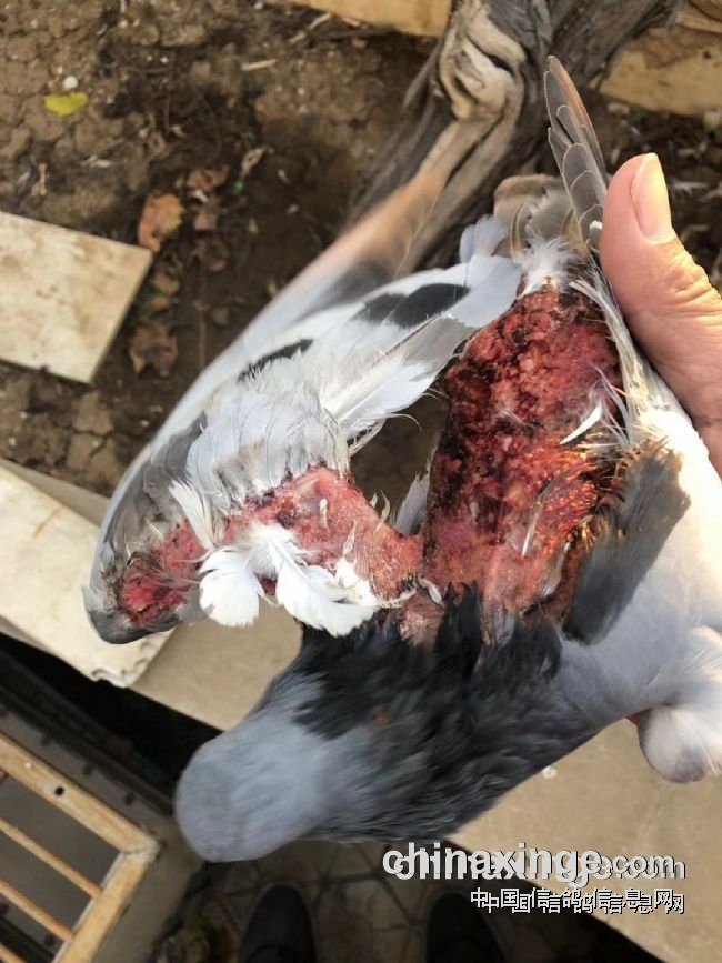 3、“赤壁英雄”:重伤归来,经历3次手术!在郑州的一场秋季公棚赛中,一只名为“赤壁英雄”的赛鸽身负重伤归来,整个嗉囊外翻暴露在外,周边羽毛沾满了已经变为黑色的血痂,水和食物被吃进去后便从嗉囊流出,让人不忍直视。庆幸的是鸽主人为爱鸽进行了3次治疗,“赤壁英雄”最终痊愈。