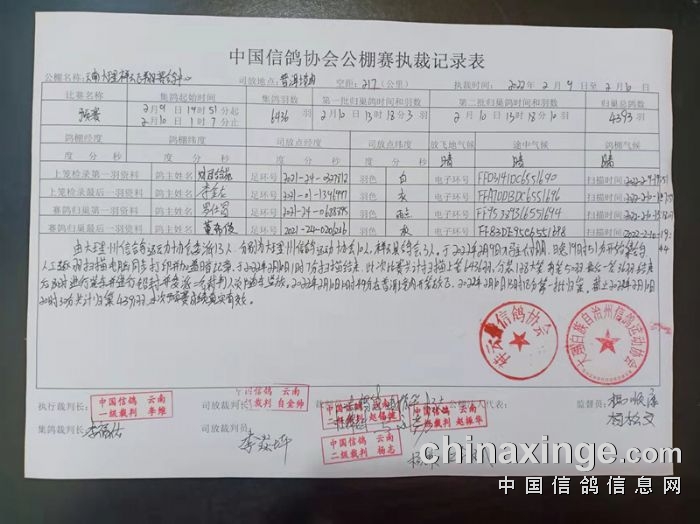 云南大理祥云飞翔赛鸽中心冬棚赛220公里预赛暨汽车大奖赛2月10日顺利结束,大理弥渡安吉赛鸽-罗仕昌获得预赛冠军,大理宾川赖永财获得预赛亚军、汽车大奖赛冠军。