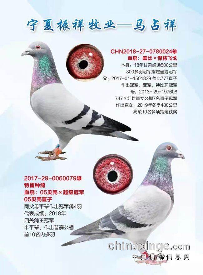 其二是要不断地引进和培育高端实战型的好种鸽充实种鸽队伍,在这方面马占祥做得很好。他近几年先后引进了盖比、波西瓦、悍将血统鸽,成绩非常恐怖,获得过冠军、鸽王亚军等等。另外他培育出的 “金卡”“石斑”鸽系也名扬塞上,获得过特比环冠军、公棚冠军等许多优异成绩。这系鸽不但在公棚飞得好,在鸽会、团队比赛中成绩也相当优异,获得过鸽王冠军、鸽王亚军等。