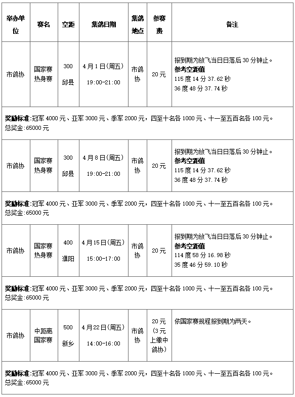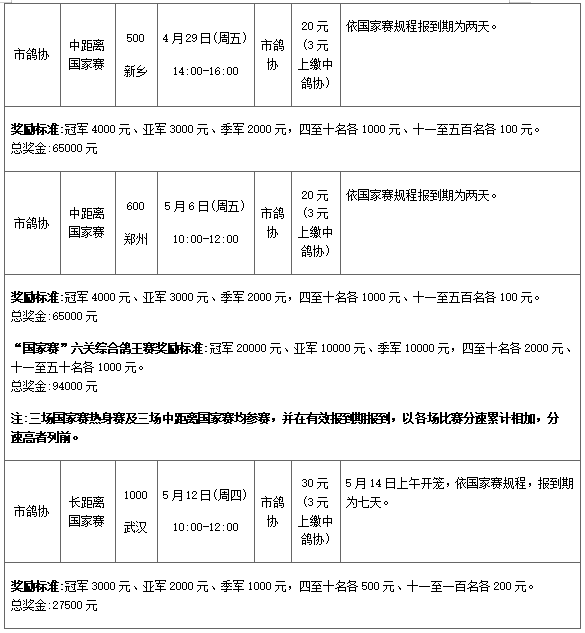 2022年,天津市信鸽协会的国家赛引来鸽友们关注,计划举办六场中短距离比赛,外加1000公里武汉长距离国家赛。前六场比赛,分别为300、300、400公里国家赛热身赛,500、500、600公里中距离国家赛,每一关奖金65000元,各录取前500名。同时,打国家赛六关鸽王赛,总奖金94000元,录取前50名,冠军奖励20000元。