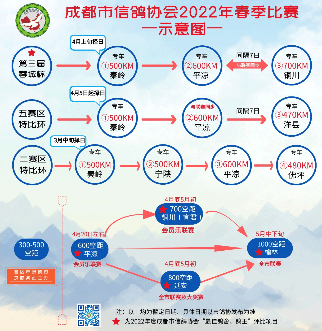 4月20日之前,各区市县鸽会及服务站要完成300-500公里的短距离热身赛,之后进入成都市会员乐联赛节奏。首先登场的是600公里平凉站联赛,之后是700公里铜川站、800公里延安站同一个时段举行,鸽友可选择参赛。