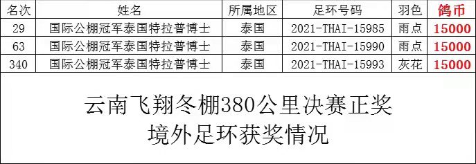根据笔者简单的统计,飞翔冬棚决赛456羽获奖鸽中有超过30羽未实名或疑似未实名的赛鸽。其中包括第4名华艺龙翔团队、第10名三毛赛鸽中心等高位名次。参赛名为苍洱鸽苑的有5羽进奖鸽,陈氏父子、鸿展鸽业、三毛赛鸽中心、天都赛鸽文化中心、鑫源圣鸽都有两羽进奖鸽。此外,飞翔冬棚决赛456羽获奖鸽中还有3羽境外足环的参赛鸽。鸽主是来自泰国的鸽友,参赛名为国际公棚冠军泰国特拉普博士。而根据中国新歌声关于境外足环参赛的有关规定,境外足环参加中国大陆地区信鸽比赛需要向中国信鸽协会报,审批通过上网公示后方可拥有和中国信鸽协会发行足环同样的效力。可笔者在该公棚网站上并未查询到境外足环使用情况的信息。在此建议全国各大公棚,如果有使用境外足环的参赛者,最好在收费结束后进行公示,提供中国信鸽协会的备案手续,打消鸽友疑惑,让鸽友放心参赛。