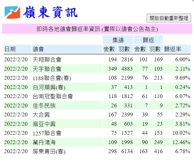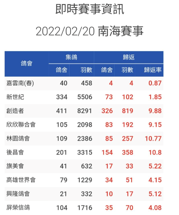 2022年中国台湾南海春季海翔五关鸽王赛第二场资格赛,于2月20日早上开笼放飞,阴雨天气,东北风7级,大浪,能见度10公里,空距距离高雄港180公里。