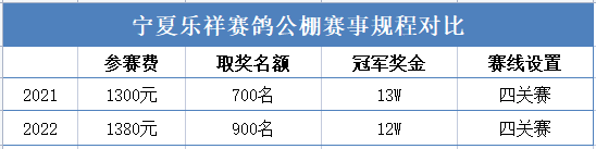 今年是宁夏乐祥公棚第十一届春赛,相比去年,在参赛费以及赛线安排均无太大变动的情况下,决赛增加200个获奖名额,同时冠军奖金相对去年稍有下降。公棚想要让奖金惠泽更多鸽友,同时加大决赛的刺激性,旧戏唱出些许新意,这是不错的选择。