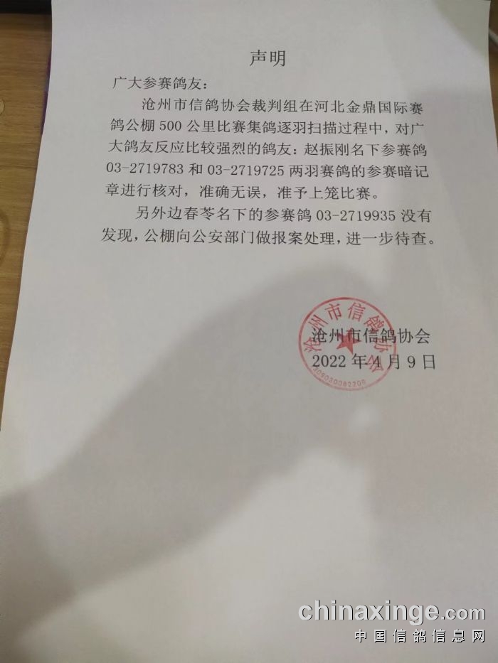 4月9日进行决赛集鸽,沧州市信鸽协会裁判组对两人名下的参赛鸽进行核对发现,赵振刚名下两羽参赛鸽暗记章准确无误,准予上笼比赛,但边春苓的03-2719935赛鸽没有发现。公棚向公安部门做报案处理。