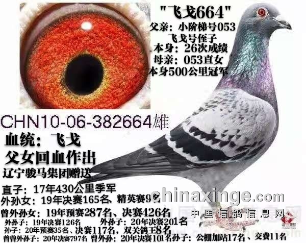19年飞戈664配一个胡本血系的雌鸽,作出一羽灰色的雄鸽,儿子获得:公棚第一次加站赛17名,第2次加站丢失,100公里前训放连快3站。