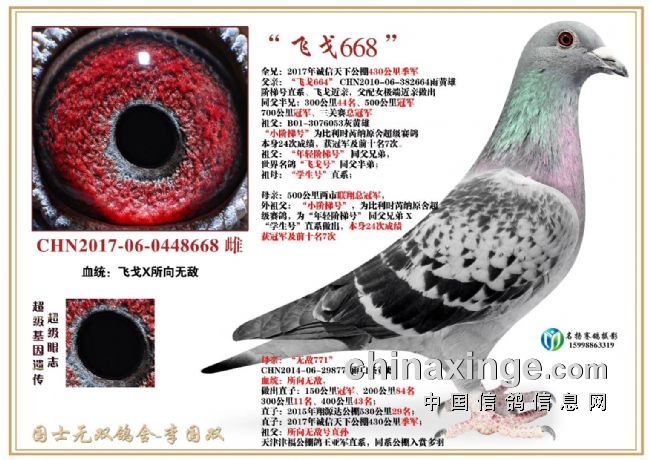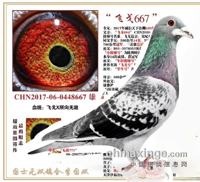 飞戈664的配对是无敌771,所向无敌血系,以上配对2017年作出5羽子代,一羽送公棚比赛获得:430公里季军,520公里决赛丢失,剩下4羽子代1公3母,都是血统鸽,它们都作出了公棚入赏鸽,最不好的名次是公棚决赛201名;