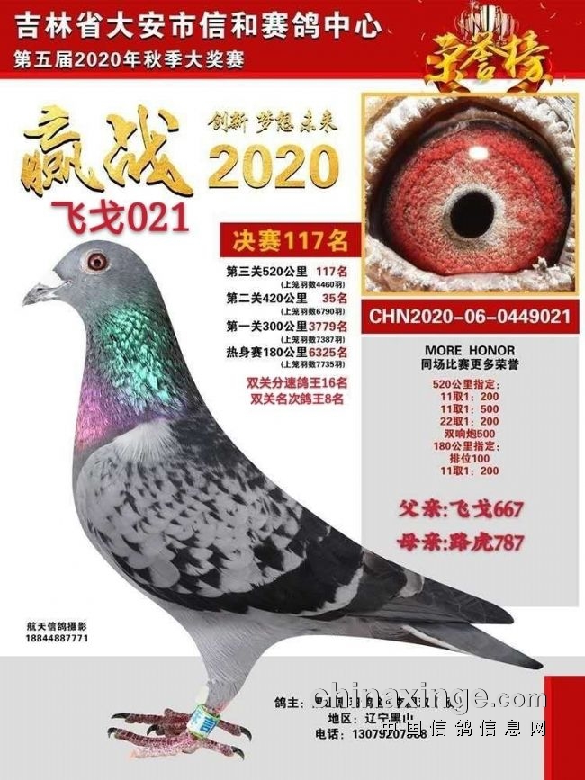 以上配对作出子代,2年送公棚11羽,入赏5羽,分别是:飞戈021、飞戈082(春棚决赛822名)、飞戈601(决赛693名)、飞戈829(团队5关42位、单关6名)、飞戈627(加站双关93名),入赏鸽不分羽色、性别和眼砂的颜色。