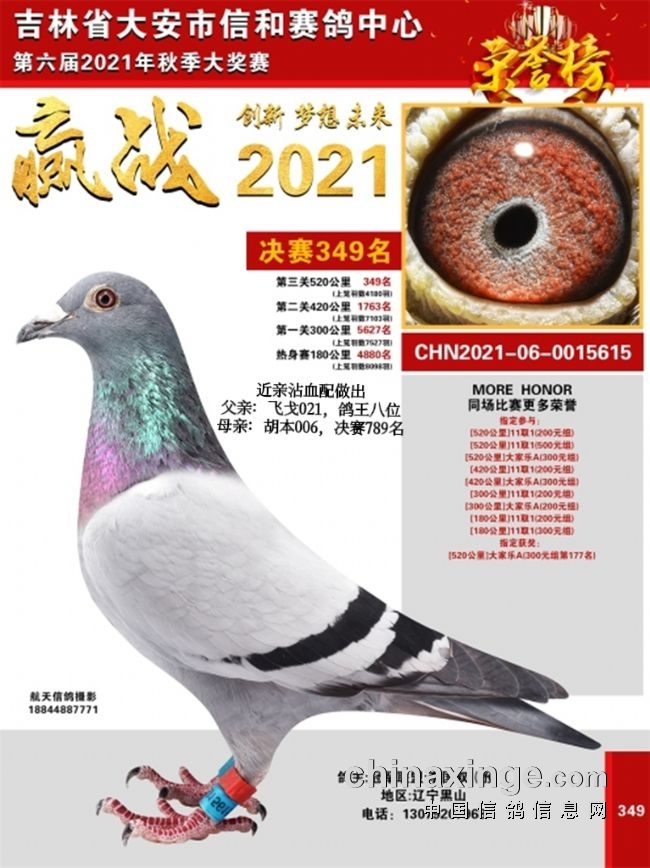 2020年精英赛9名交配063灰砂雄,作出:路虎068灰砂雌,后者的哥哥,获得:2021年辽宁天一春棚300公里预赛77名;
