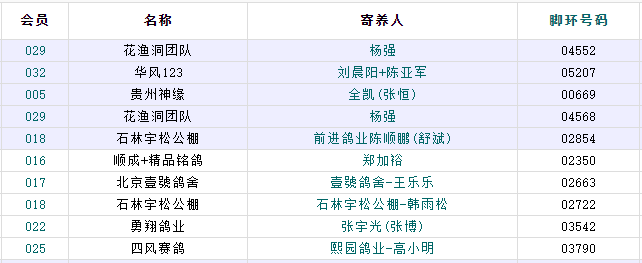 还好,不幸中也有实力与运气兼具的人,花渔洞团队杨强再次登顶冠军宝座,他第一关的95名04552以1000.98598米/分的分速夺下第二关冠军宝座,第一关的41名04568则获第二关殿军,也是双关鸽王冠军。第一关的冠军04621在第二关中没有归巢数据,有点可惜。