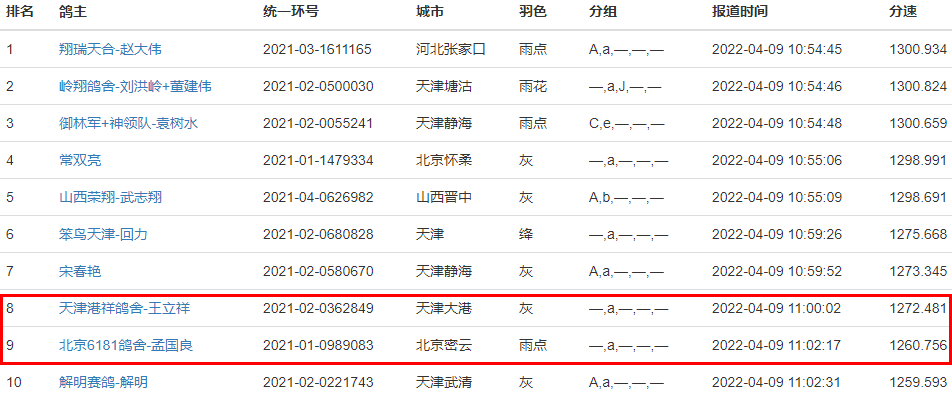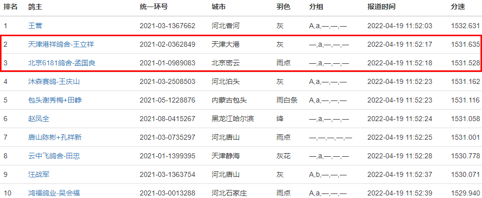 一羽环号为2021-02-0362849的灰鸽11点52分17秒报到,以1531.635米/分获得亚军,鸽主是天津大港的鸽友。一羽环号为2021-01-0989083的雨点落后1秒钟,获得季军,分速为1531.528米/分,鸽主是北京密云的鸽友。