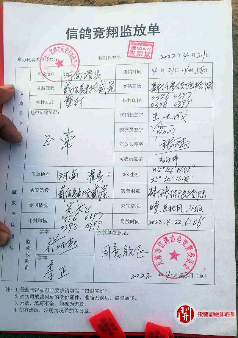 2022年开创者国际赛鸽公棚(春棚)430公里第二关4月22日早上06:06于河南滑县开笼,天气晴,东北风风力4级,司放4366羽,放飞地坐标为东经114°46′56.87″,北纬35°30′10.38″。