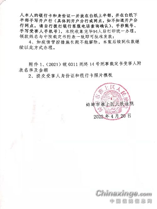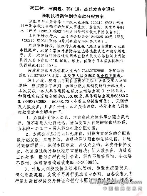 2022年4月20日,安徽蚌埠市淮上区人民法院发布《高正林、高巍巍、郭广道、高廷发责令退赔强制执行案件到位案款分配方案》,裁定以上执行人应退赔款金额为1244325元,目前已实际到位执行款914115.4元,待发放案款与总债权之比为0.73462752898,受害人将根据此系数计算申领赔偿款。