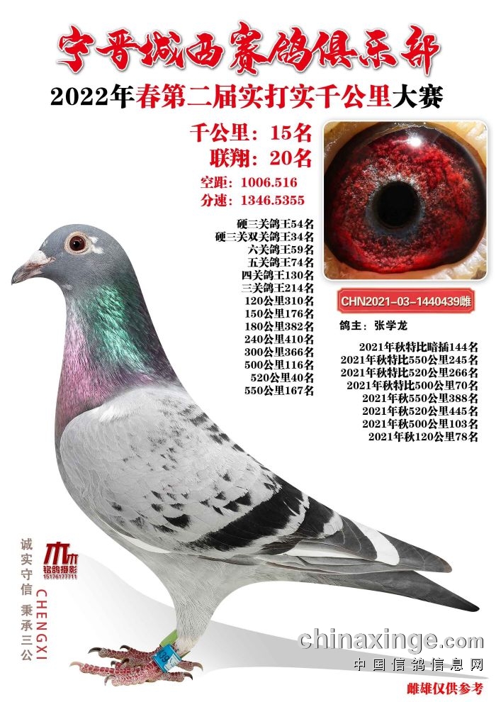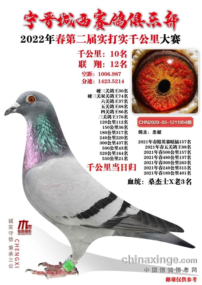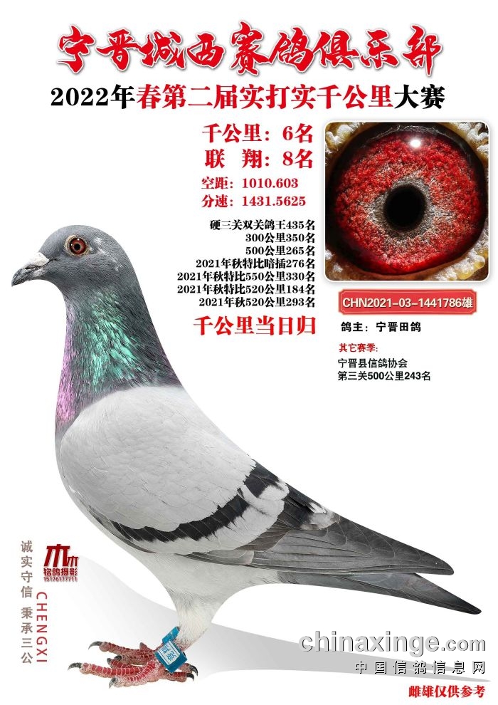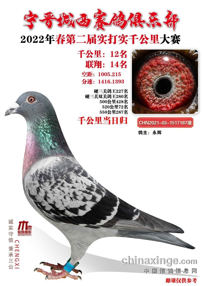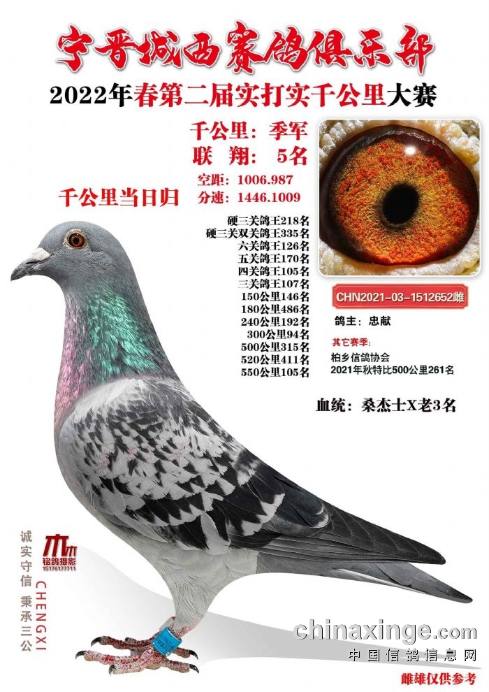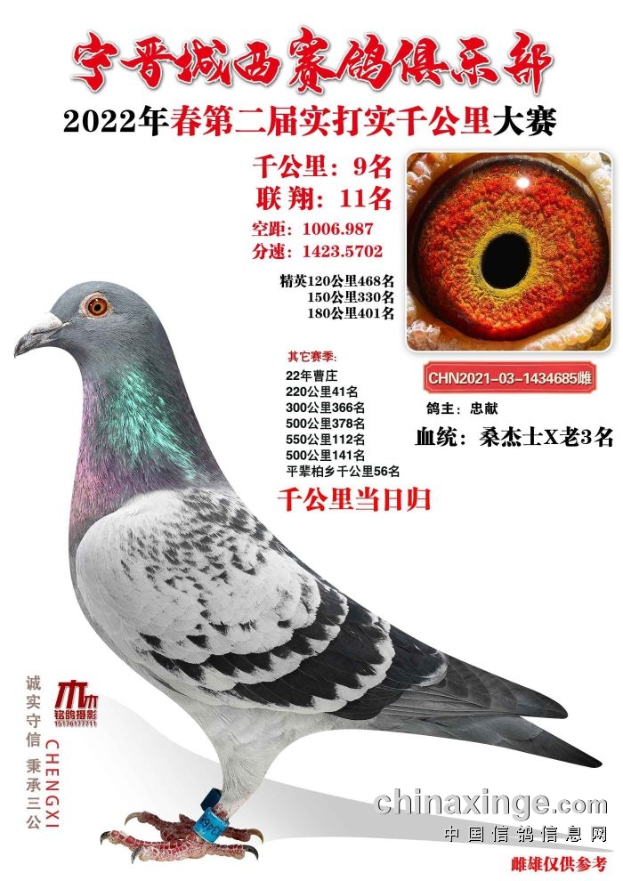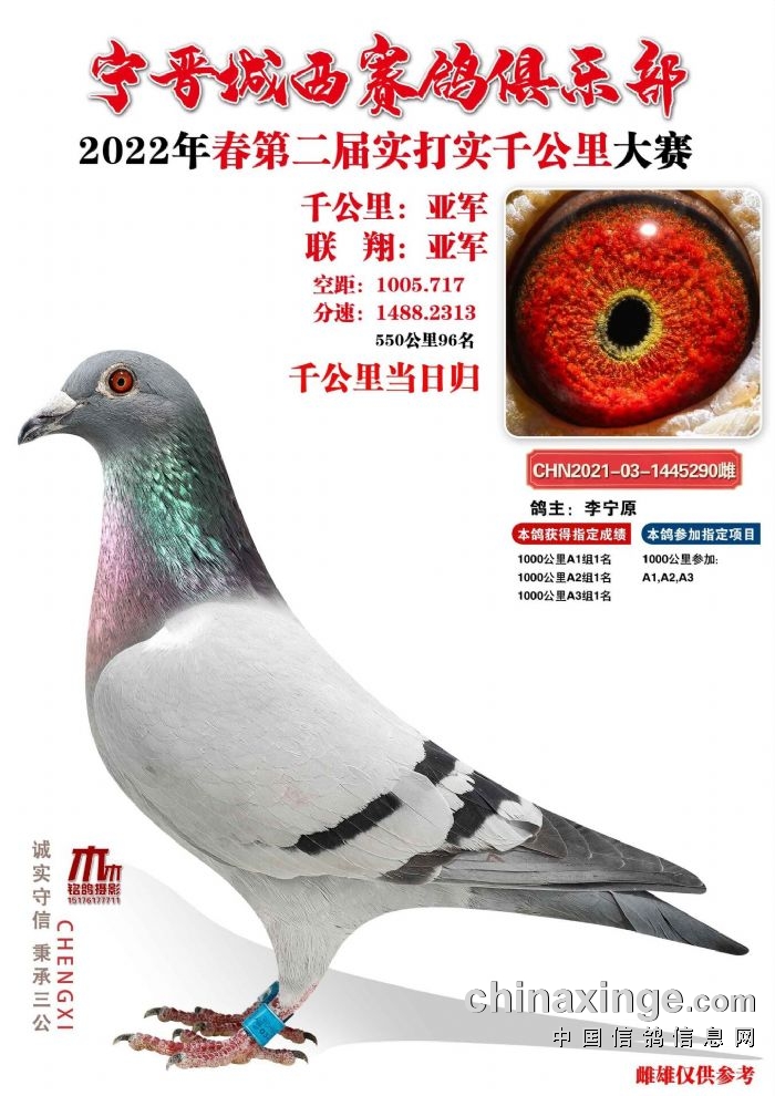 李宁原鸽友高价引进胡本血系,从180公里到1000公里,六关鸽王都有过前十的赛绩,李宁原鸽友进入鸽界两年时间,基本每场比赛都会出现在前位奖,可见鸽子血统纯正,2022年千公里当日归有飞出俱乐部亚军联翔季军的好成绩。