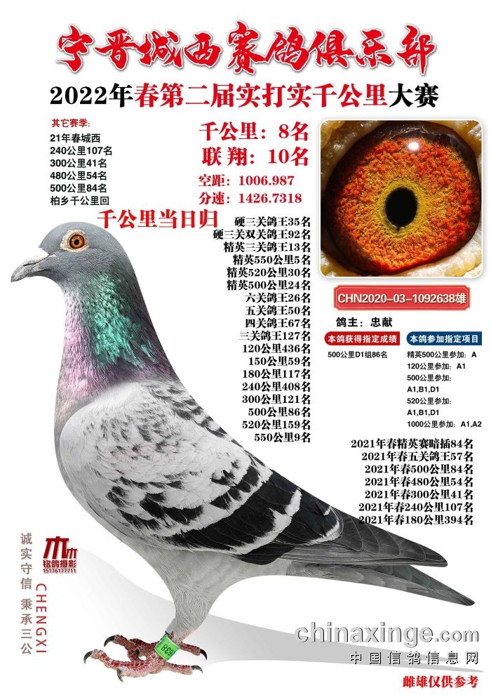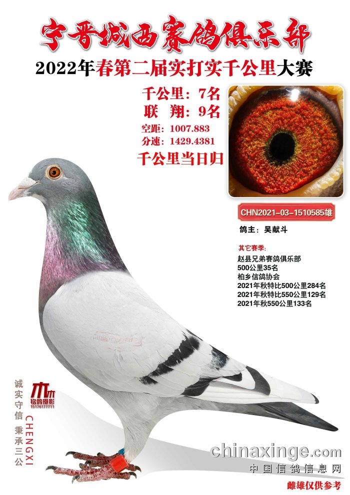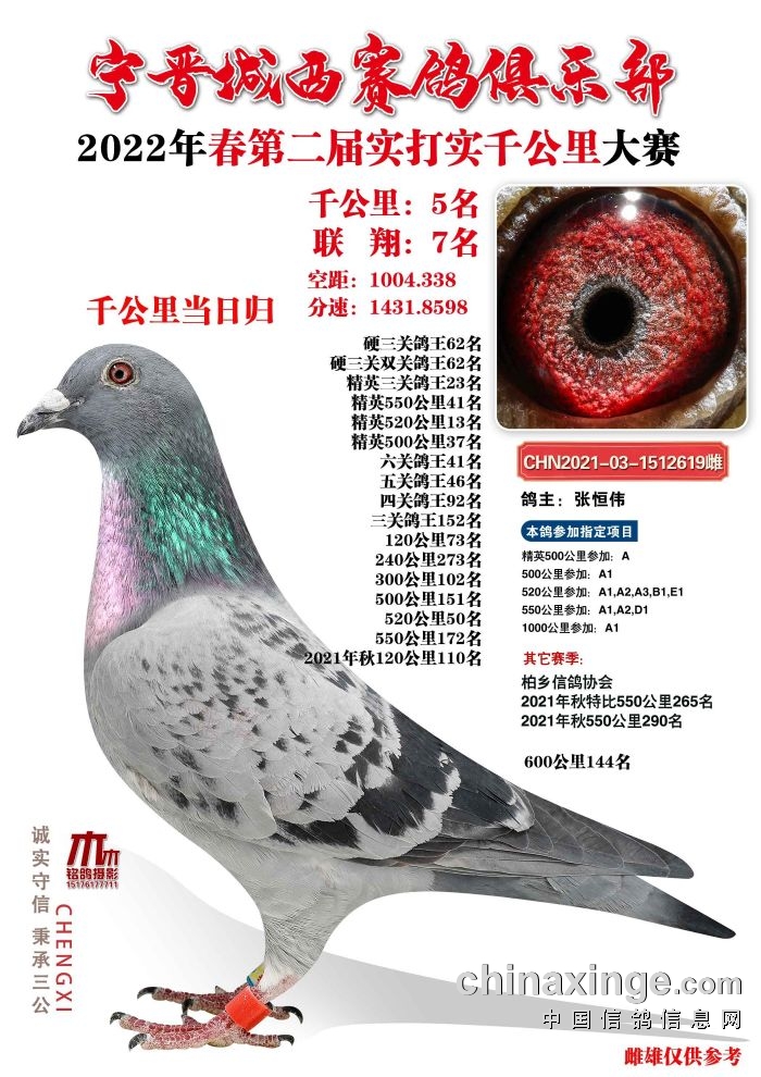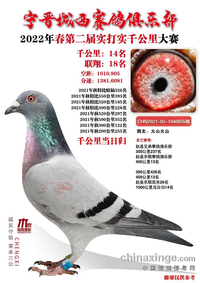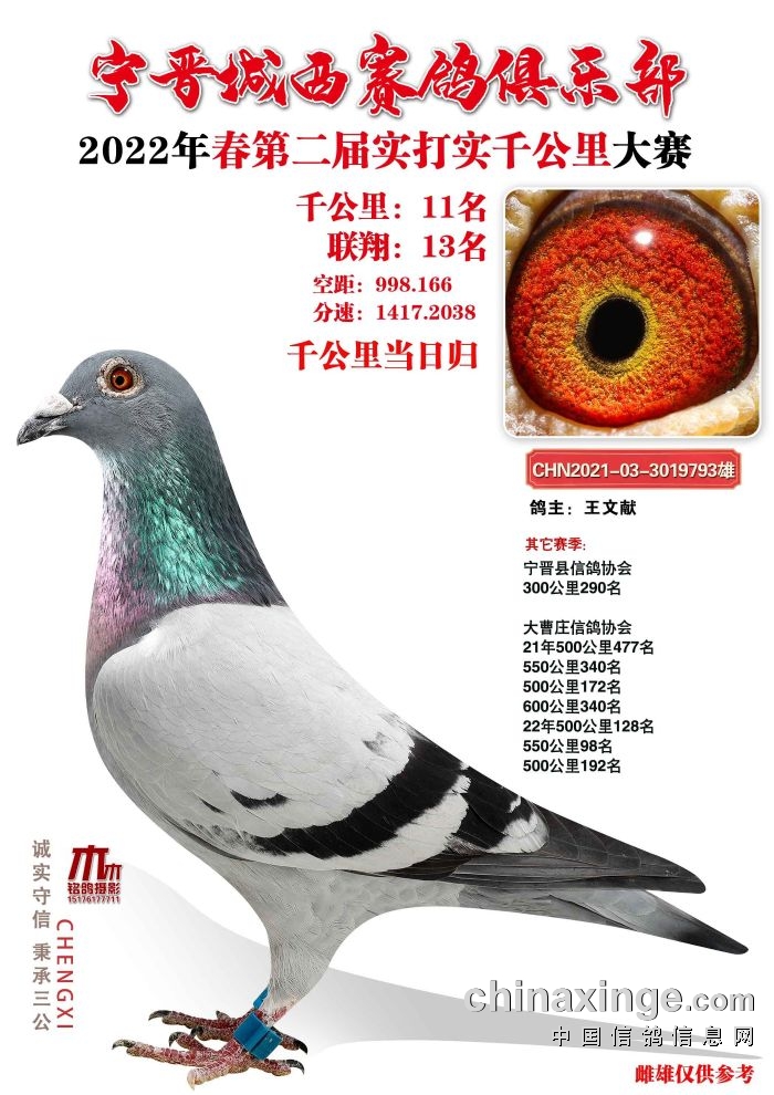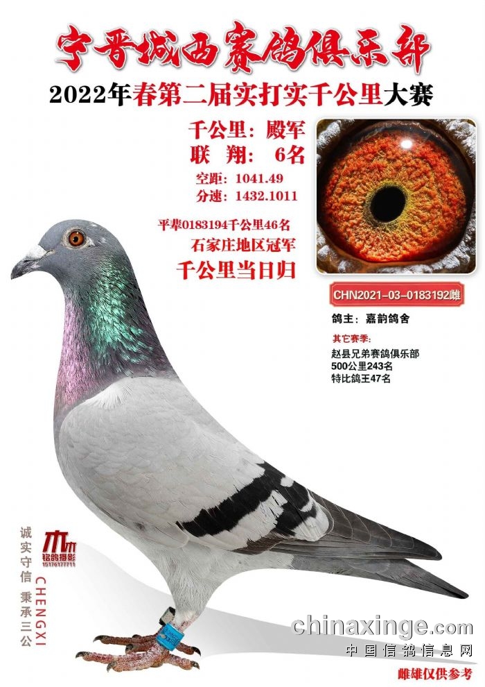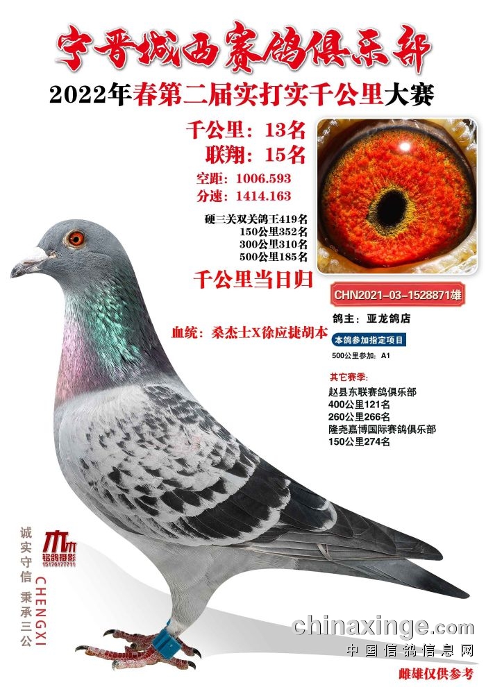 李宁原鸽友高价引进胡本血系,从180公里到1000公里,六关鸽王都有过前十的赛绩,李宁原鸽友进入鸽界两年时间,基本每场比赛都会出现在前位奖,可见鸽子血统纯正,2022年千公里当日归有飞出俱乐部亚军联翔季军的好成绩。