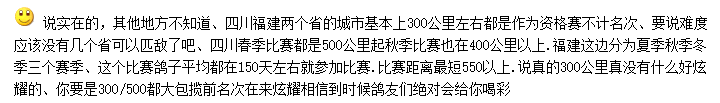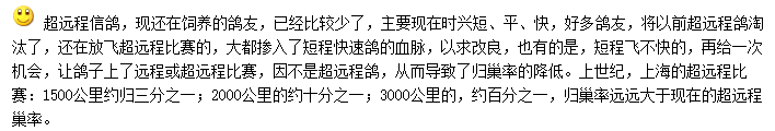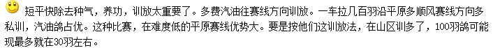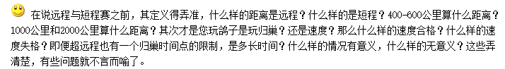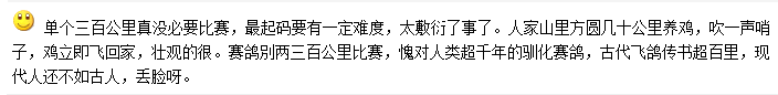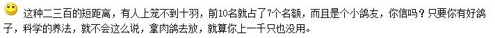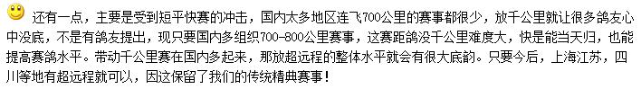 我呵呵了,意思是这么多公协俱、千千万万的鸽友在玩小孩子过家家?驯化的过程一定是往长距离的反向发展吗?我觉得绝对化了,其中应该还包括赛鸽定向、速度、抗逆等方面能力的提升,如果仅仅追求距离,那么现在的大多数比赛意义在哪?