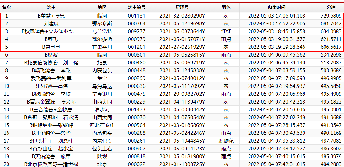 这场比赛相当艰难,直至下午17点06分04秒,第一羽鸽才归巢报到,分速仅为729.6809米/分,赛鸽环号为2021-32-0280290灰鸽,鸽主是临河董慧+张忠。