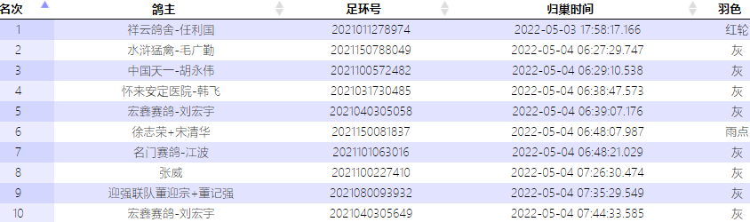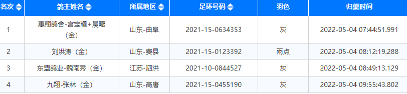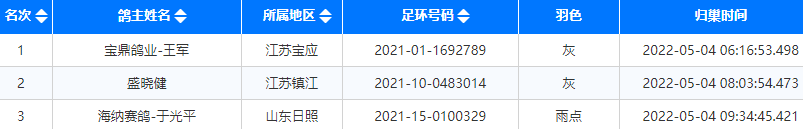 5月4日继续报到,三家公棚均有赛鸽归来,江苏宝应宝鼎鸽业-王军的2021-01-1692789灰鸽于6点16分归巢报到,以1008.3874米/分获得沂蒙春棚900公里冠军。