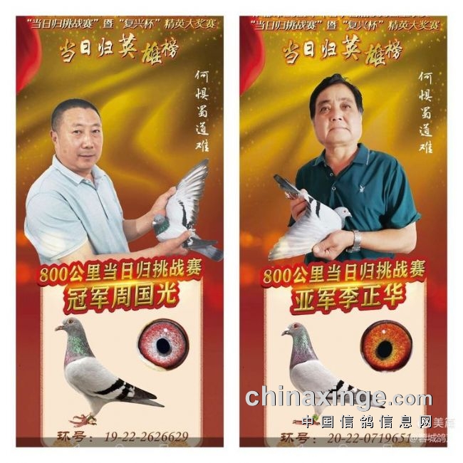 龙泉驿区会员周国光的2岁雌鸽和成华区会员李正华1岁龄雌,优异成绩,永载成都800空距联赛史册,随后冠亚军鸽分别被外省及本地爱家以重金收藏!
