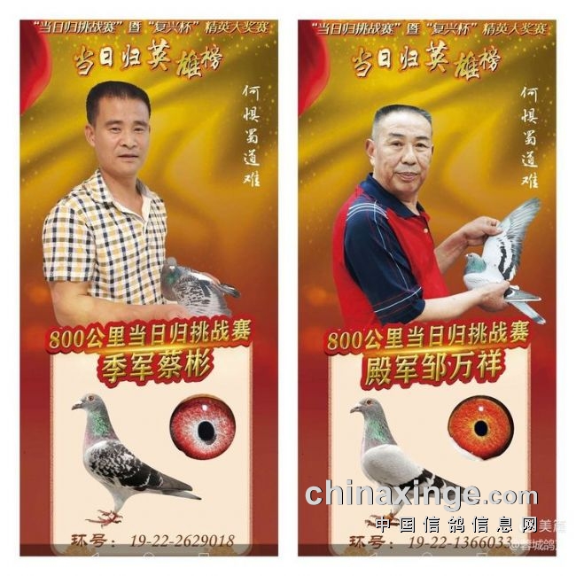 来自金堂县的蔡斌和邹万祥,长距离好手会员,以13小时15分和13小时25分,完成785空距艰难征程,分别夺得当日归季军和殿军荣誉,为自己赛鸽生涯再添新辉煌!