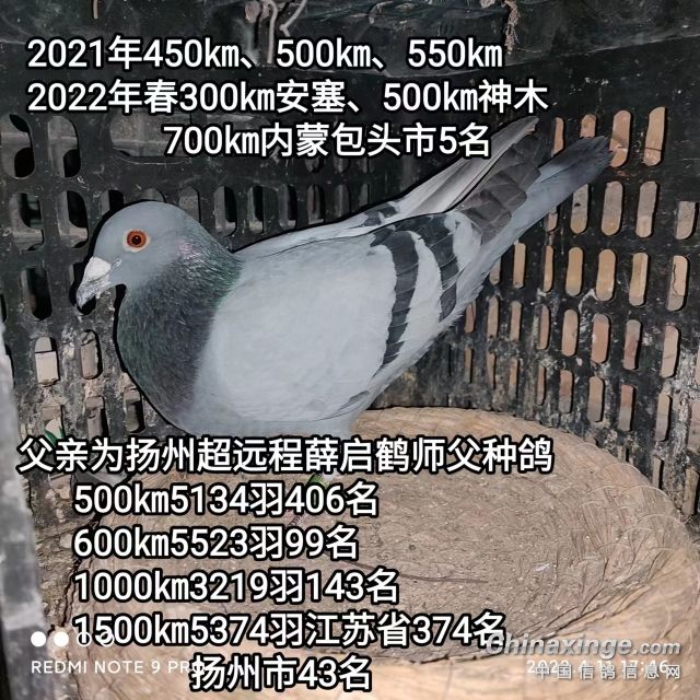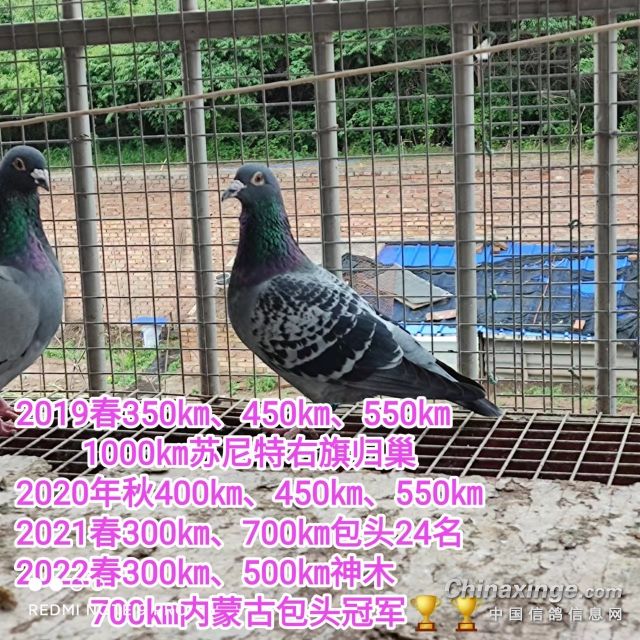 据笔者了解,此次冠军鸽,在19年春350-450-550公里训放归巢,1000公里内蒙苏尼特右旗开笼地,5级西北风,开笼第七天艰难归巢,其祖父为99年咸阳千公里五名,吴淞;20年秋,400-450-500公里训放归巢;21年春,300公里训放归巢,700公里包头24名;22年春,已经训放过300-500公里。