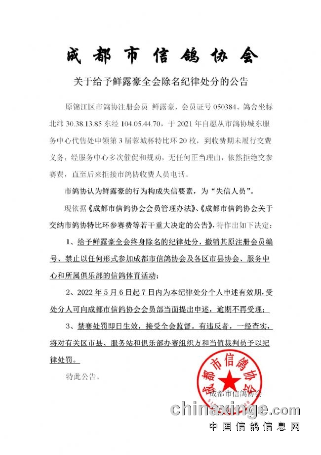 在鸽界,无论是公棚、协会、俱乐部平台,还是鸽友、个人,都应该遵守的一个准则,就是诚信。然而,“失信”行为却频频出现,屡见不鲜。近日,在成都市信鸽协会,也出现这样一件“失信”之事。一名会员在自愿申领了20枚蓉城杯特比环后,经过多次催促、规劝,却始终拒绝交参赛费,甚至直接拒接电话。为此,成都市信鸽协会发布公告,将其纳入“失信人员”名单,对该名会员进行终身除名、撤销会员编号、禁赛等处罚。