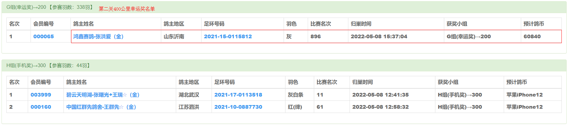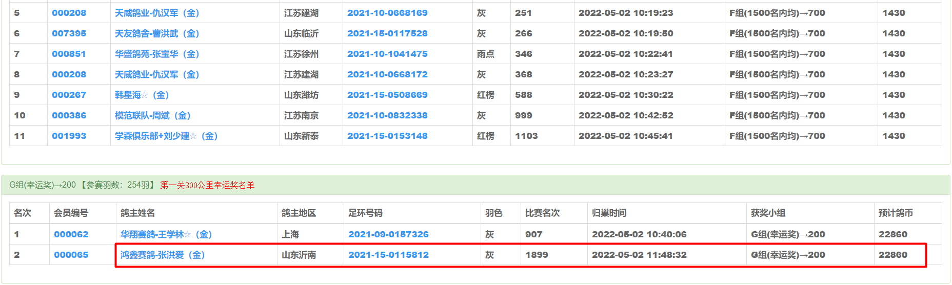 此鸽在300公里第一关飞得1899名获得幸运奖,又在400公里第二关赛事中飞得896名获得幸运奖。