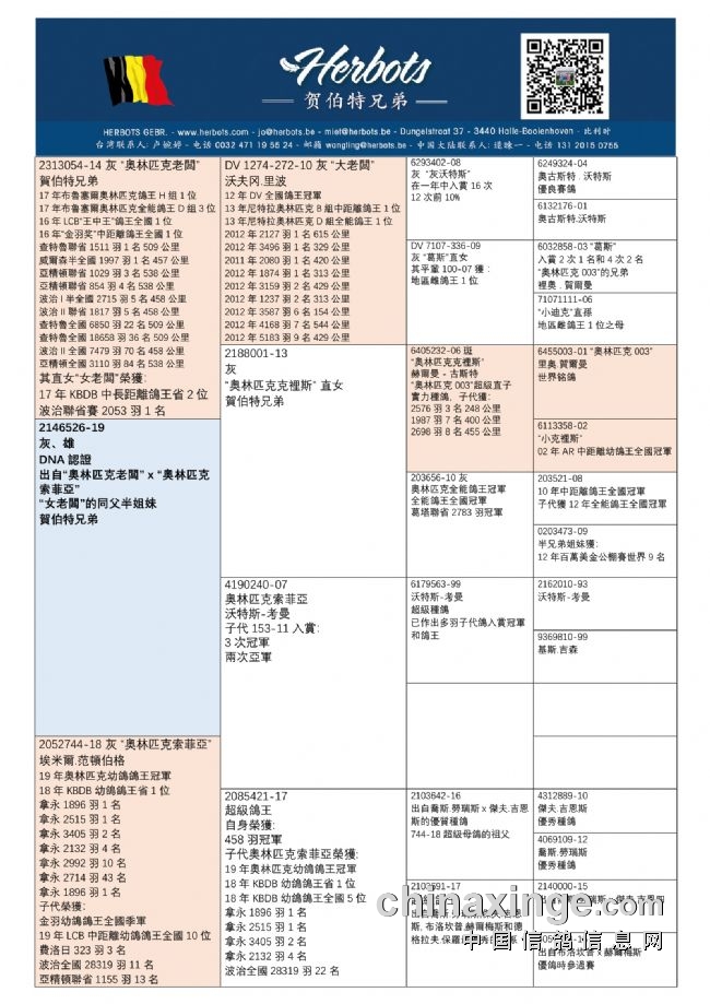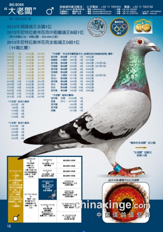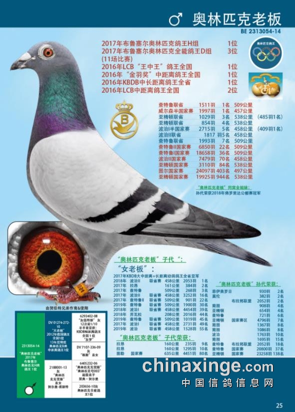 其中“奥林匹克老板号”是2017年布鲁塞尔奥林匹克H组鸽王冠军、D组全能鸽王季军(11场比赛计算),是德国名家沃夫冈·里波12年DV全国鸽王冠军、13年尼特拉奥林匹克B、D组双鸽鸽王冠军“大老板”的直子。