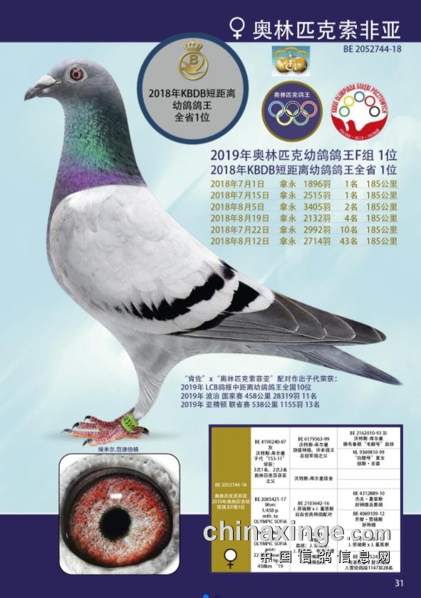 “奥林匹克索菲亚”获得2019年奥林匹克F组幼鸽鸽王冠军,2018年KBDB短距离幼鸽鸽王全省冠军。