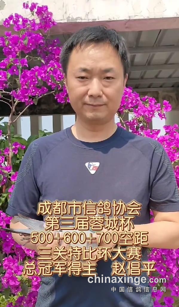 “蓉城杯”号称难度最大的一岁鸽特比环大赛,赛鸽要在20多天的时间里连战三场,两次飞越秦岭、巴山,十分考验鸽子的综合素质与实力。赵倡平的2021-22-0668402飞行总空距1752.56公里,总分速为3606.7818米/分,以领先26米/分的速度登顶三关鸽王总冠军宝座。