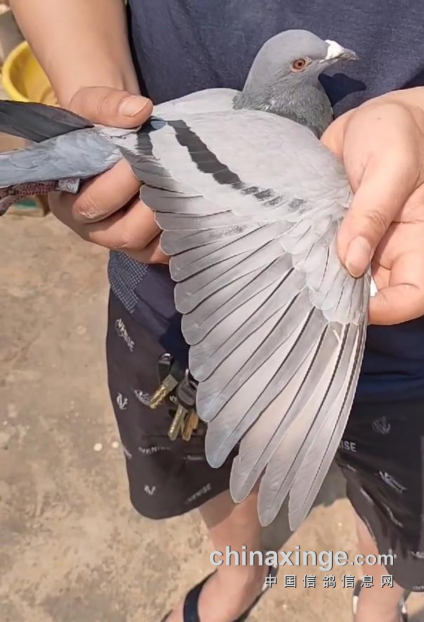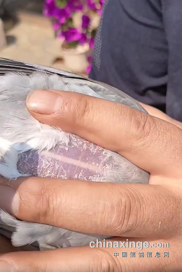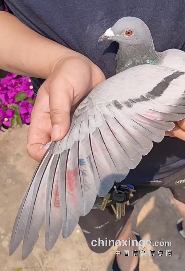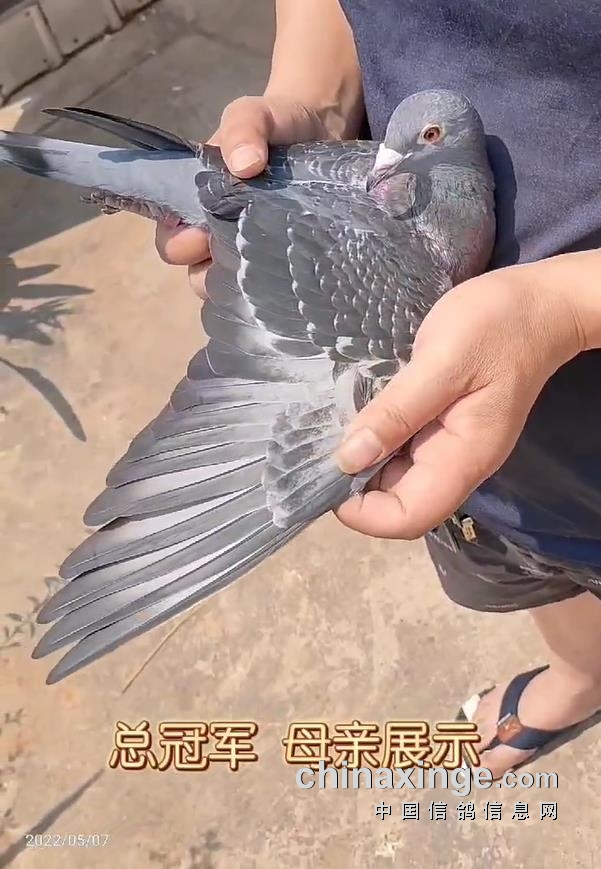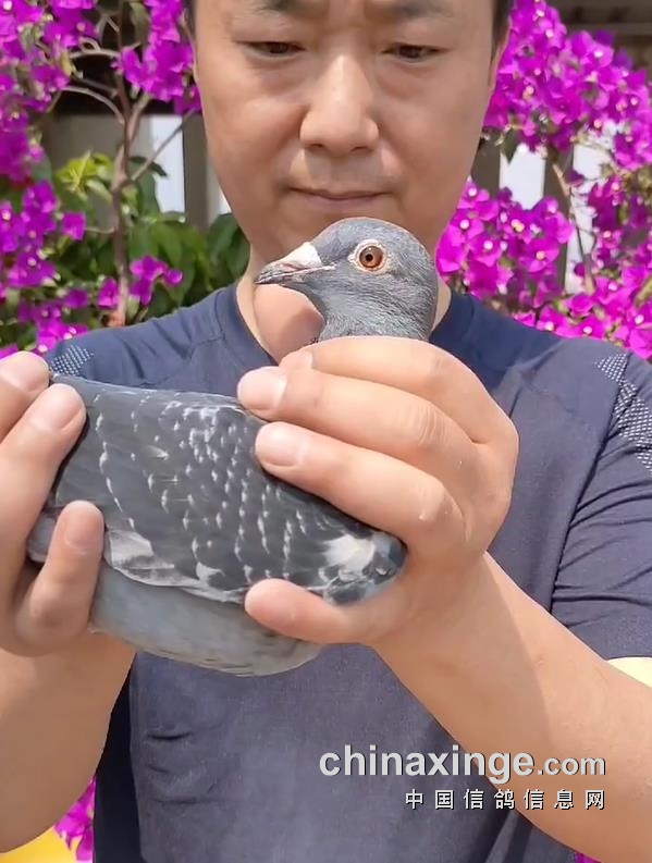 冠军鸽是一羽灰色黄眼雌鸽,膀条硬朗,肌肉非常好,龙骨比较高。母亲是一羽超长距离飞下来的深雨点黄眼雌鸽。