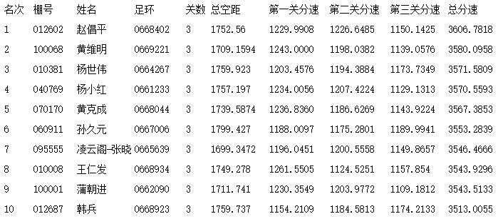 这羽鸽子三关都在归巢鸽的领航部队中,名次、分速分别是500公里120名、1229.9908米/分,600公里5名、1226.6485米/分,700公里19名、1150.1425米/分,500、600公里双关鸽王季军。