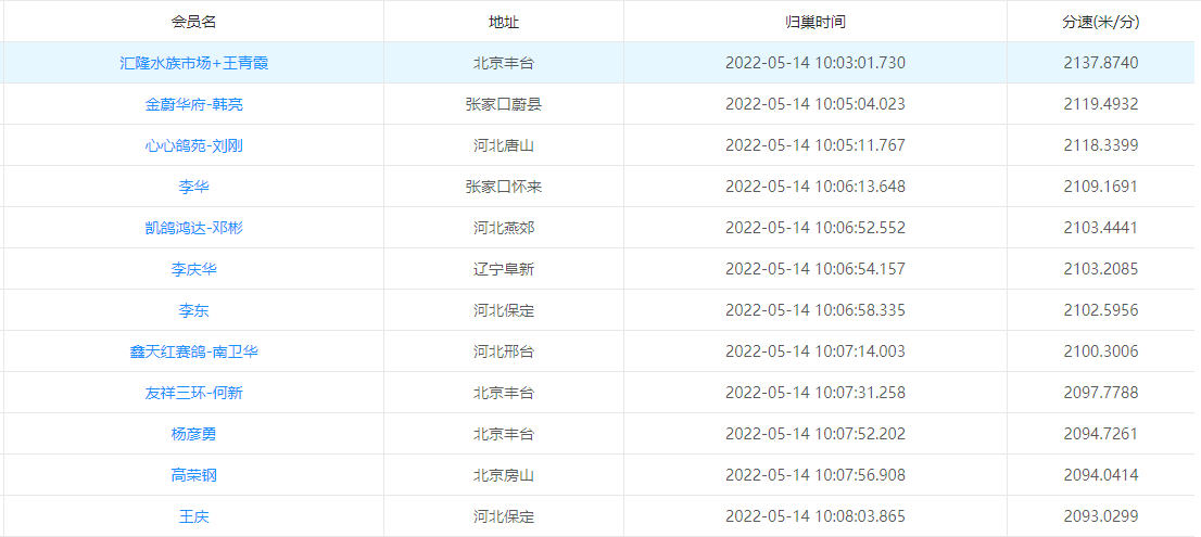 截至上午12时30分,已有901羽赛鸽归巢,4小时归巢率达33.77%,赛况良好。本次比赛聚集各路英雄赛鸽,战况激励,21羽赛鸽都飞出2000+的高分速,而汇隆水族市场+王青霞的一羽环号2021-01-0246319雨点信鸽,更是以2137.8740米/分的高分速傲视群雄,勇夺冠军!