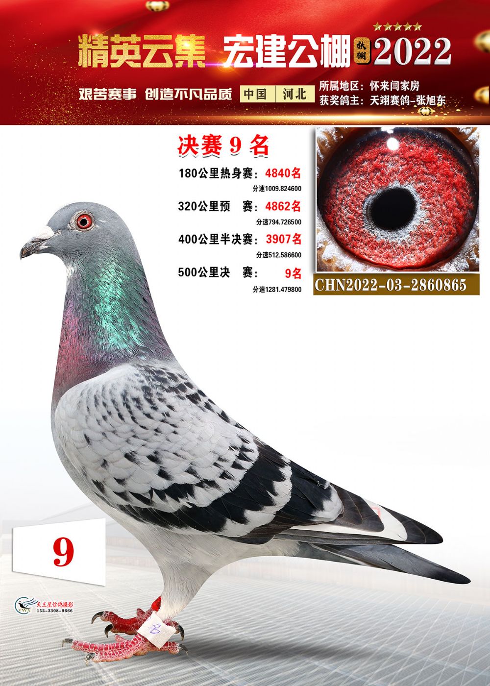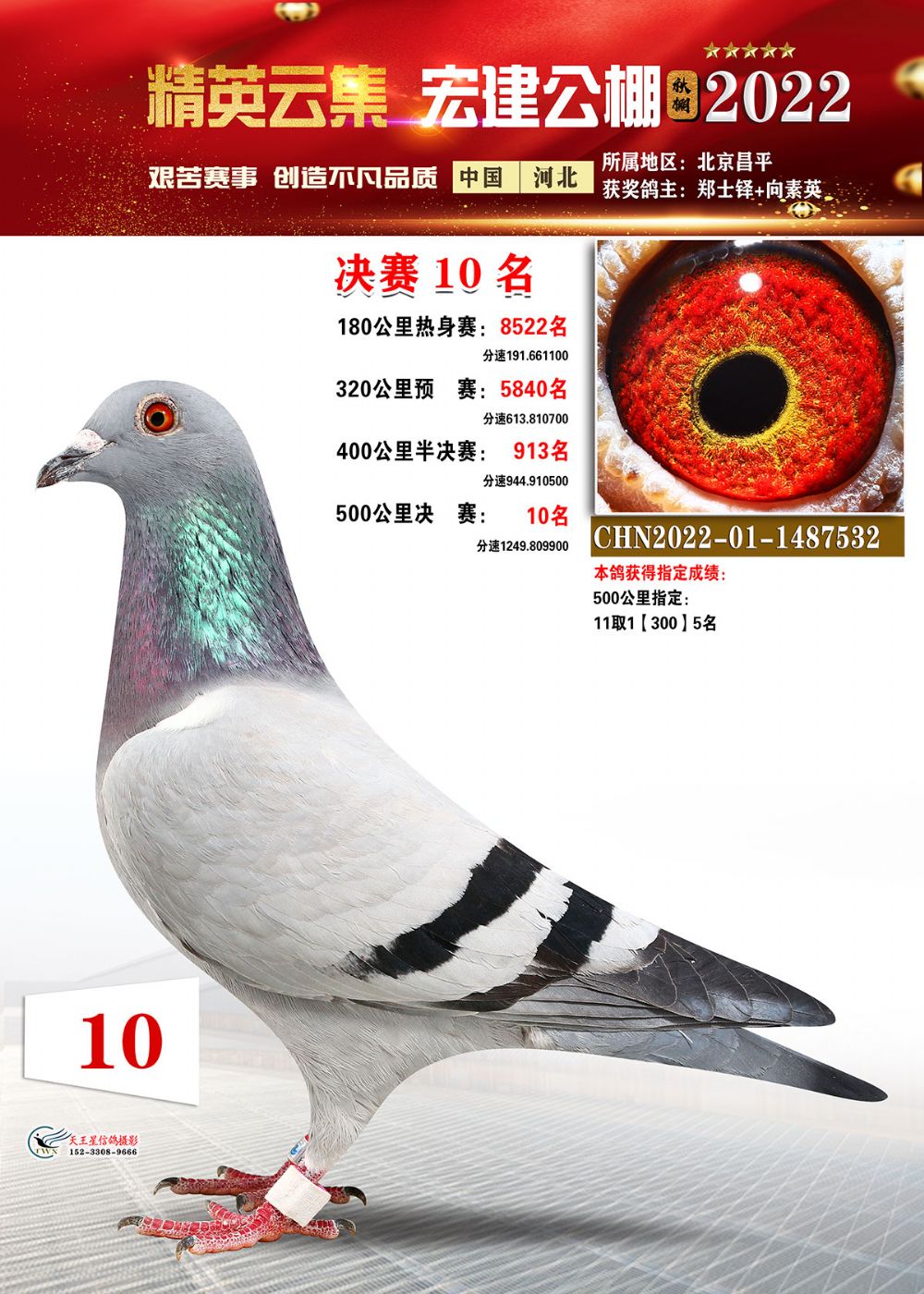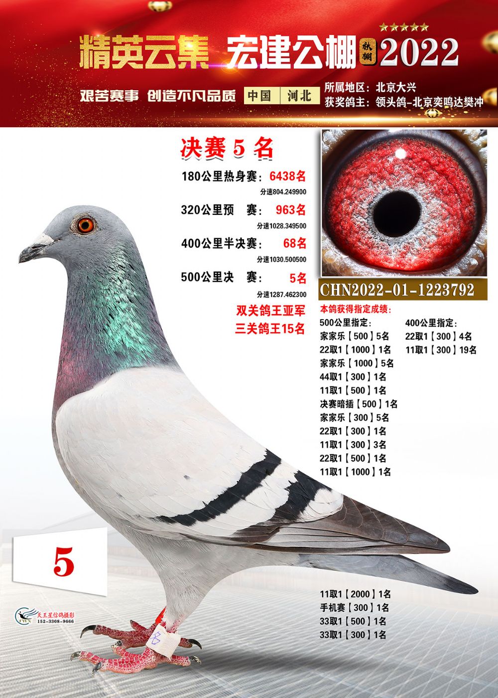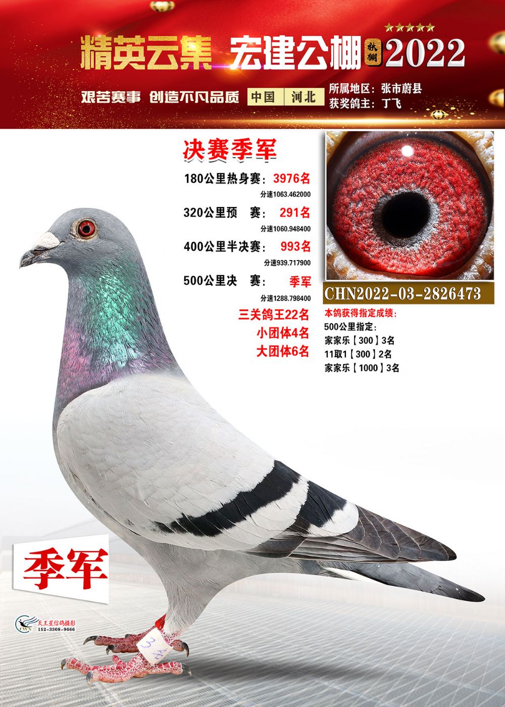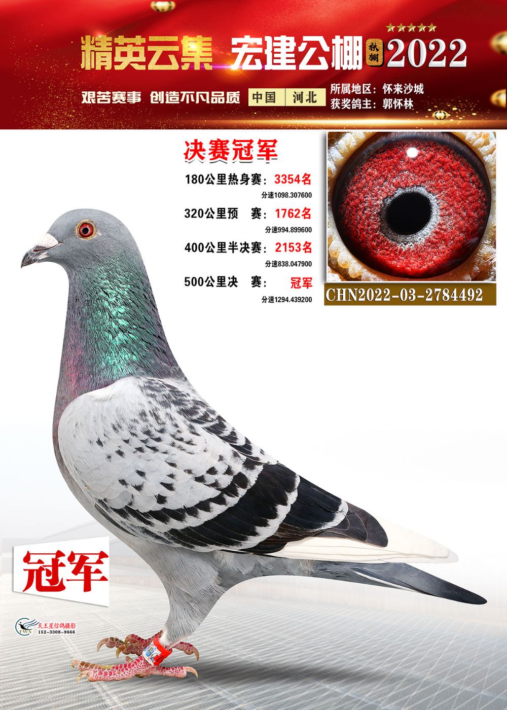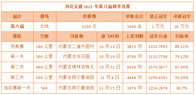 铁鸽出征展宏图,万羽齐飞建战功。河北宏建赛鸽公棚2022年第八届秋季赛事,历经13次训放,闯过了180公里热身赛,通过了一关300公里、二关400公里、三关500公里的考验,历时两个多月终于落下帷幕。万羽赛鸽一路过关闯将,通过层层考验,最终摘得属于自己的荣耀!在500公里决赛中,郭怀林2022-03-2784492的雨花鸽登上冠军宝座,分速1294.4392米/分;亚军是胜翔轩-高飞2022-03-2244809的灰鸽,分速1289.0579米/分;季军被丁飞2022-03-2826473的灰鸽斩获,分速1288.7984米/分。三关鸽王桂冠被张月清2022-03-2930409的雨点鸽摘得,三关成绩分别为:300公里458名、400公里21名、500公里29名。