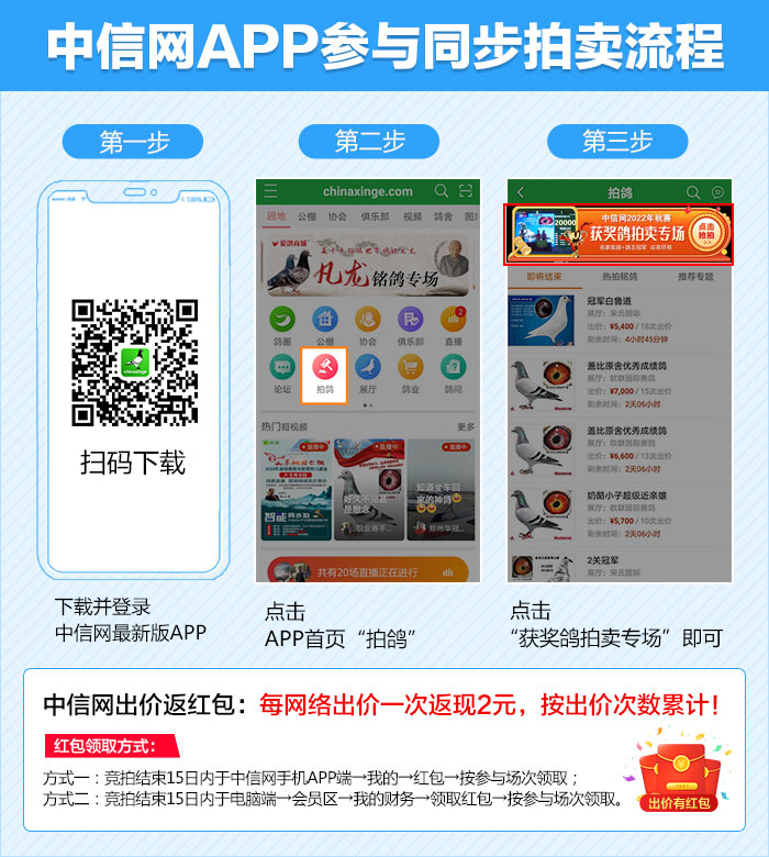 好鸽已就位,等你来拍!11月28日,河北宏建赛鸽公棚将举行2022年获奖鸽颁奖暨拍卖大会,同时,公棚将联合中国信鸽信息网推出“现场与网络同步拍卖+视频直播”服务,鸽友们可登录中信网,提前出价看好鸽。边看直播边竞价,冠军奖鸽带回家!即刻下载中信网手机APP,轻松出价,快人一步!